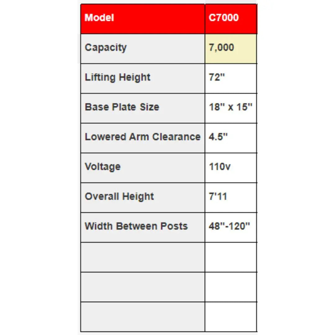 Safety is paramount with the C7000, which features an automatic locking ladder system and welded construction for added stability and security during operation. Operating on a standard 110 volts, this lift is not only powerful and reliable but also convenient for use in various settings without the need for specialized electrical setups.