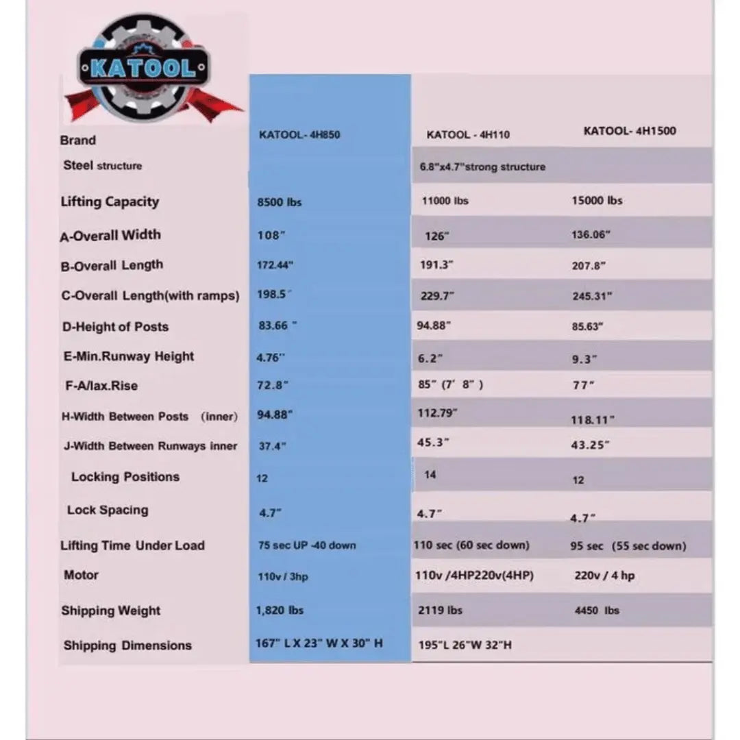 Equipped with a single-point manual safety lock release and four mechanical locking devices featuring primary and secondary safety locks, the KT-4H150 ensures secure and controlled operation. Its non-skid diamond platforms, adjustable safety lock ladders, and included turn tables for wheel alignment further enhance its functionality. Powered by a high-quality hydraulic system with a 3KW motor, this lift is available in 220V/60HZ/1PH or optional 110V/60HZ/1PH configurations. Additionally, it includes one 6,000 lbs rolling jack for added convenience.