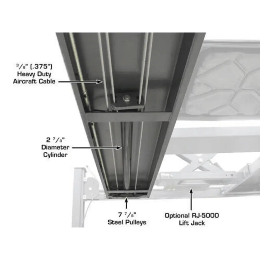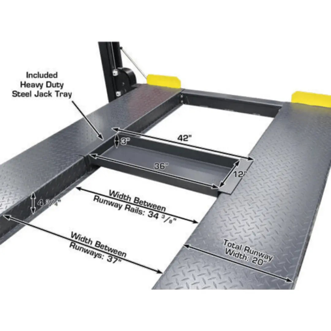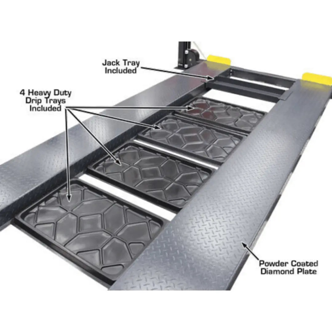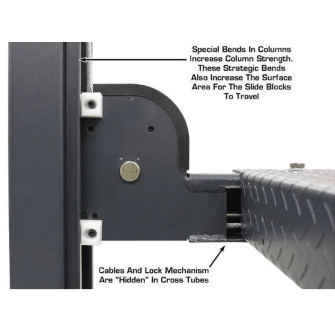 The Atlas® 408SL super deluxe portable vehicle storage lift is designed for those car enthusiasts who demand the absolute best look and superior quality. The 408SL has all the great features of our Atlas® Garage Pro Series 4 post hobbyist lifts, but incorporates many features found only on our Atlas® commercial grade 4-post lifts. All columns incorporate two special bends which help to increase the column strength. These strategic bends also increase the surface area for the slide block to travel. Horizontal cables are “hidden” inside of the cross tubes. Professional grade wheel covers are used to eliminate almost all exposure of cables and the double lock system. The Atlas® 408SL has “more metal” and weighs over 100 lbs. more than other hobbyist lifts based upon the same column and runway configuration.