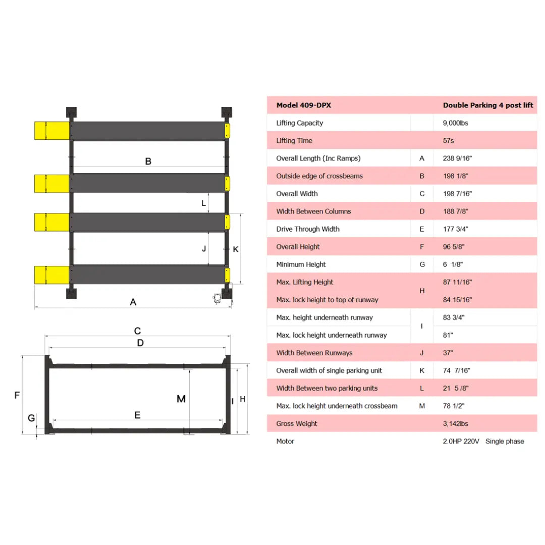 - Lifting capacity: 9,000 lbs, max. car weight:6,000 lbs.