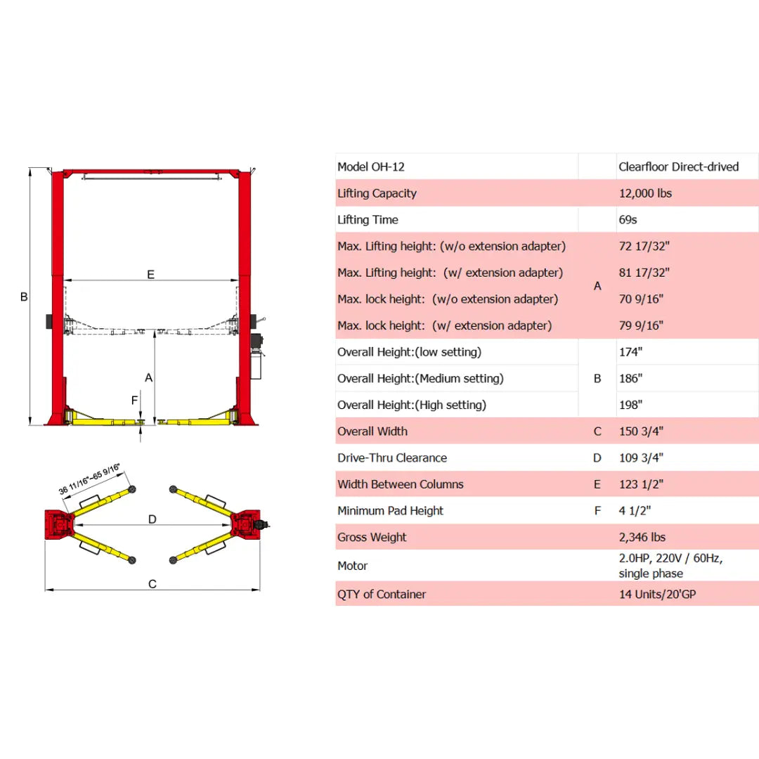 Elevate your automotive service offerings with the AMGO OH-12 2 Post Car Lift, a powerhouse of efficiency and reliability designed for both professional workshops and discerning home garages. With a formidable 12,000 lbs capacity, the OH-12 stands ready to tackle a wide array of vehicles, from compact cars to heavy-duty trucks, ensuring your lifting needs are covered across the board.
