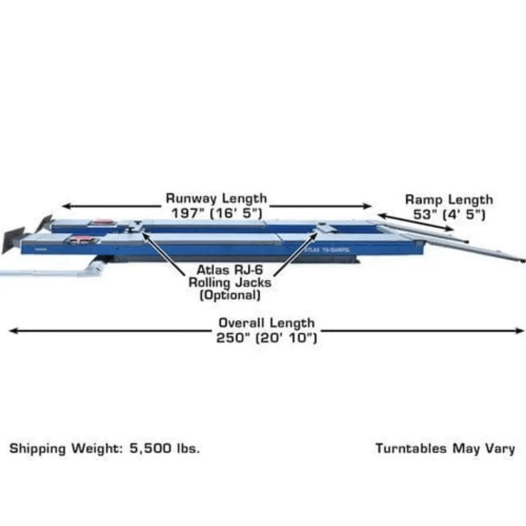 The Atlas® 12AWFSL scissor lift also includes an integrated wheels free system powered by the Atlas® RJ-6 rolling jack. The RJ-6 is designed to lift the vehicle off the runways to perform wheel and brake service. The RJ-6 is equipped with expandable rail supports which allow the rolling jack to be positioned properly for just about any vehicle. The RJ-6 rolling jack includes a set of truck adapters and rubber pads. The RJ-6 is air operated (70-105 PSI) and requires no electrical connections.